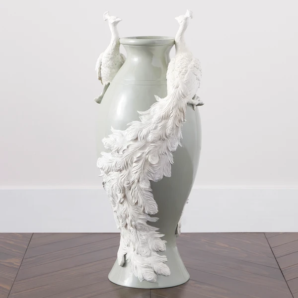 A stunning accent even when it’s not holding blooms or branches, this floor vase is made from lightweight polyresin in a soft green hue with an intricate, dimensional peacock motif that wraps around the exterior.