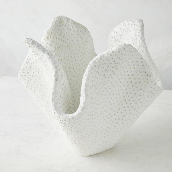 Featuring a ruffled coral-like design in a white finish, this beautifully textured vase adds a nautical accent to any shelf.