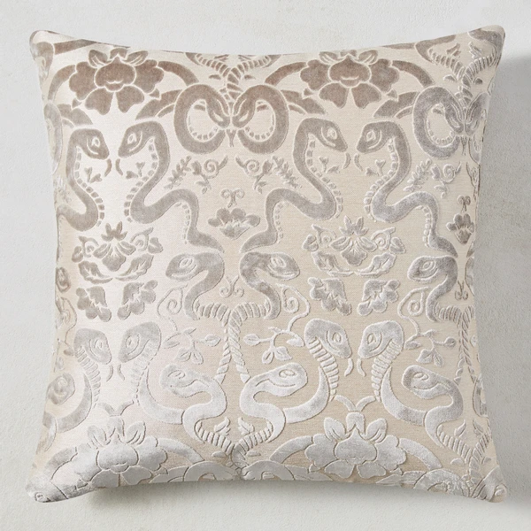 An intriguing snake-and-flower design pops on this cut-velvet pillow, making it a stunning accent for any sofa, bed, or chair. Insert included.