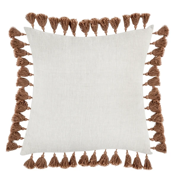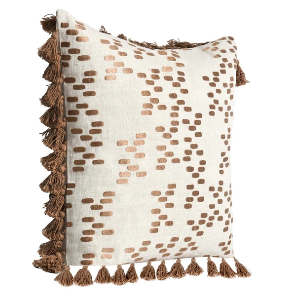 The Hamish pillow features light-brown tassels with metallic embroidery, offering a modern twist on a classic Victorian-era design. The intricate detailing and elegant color palette create a timeless and sophisticated look that will add a touch of luxury to any space. The soft feather blend insert also provides a luxurious supportive feel.