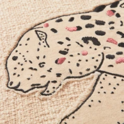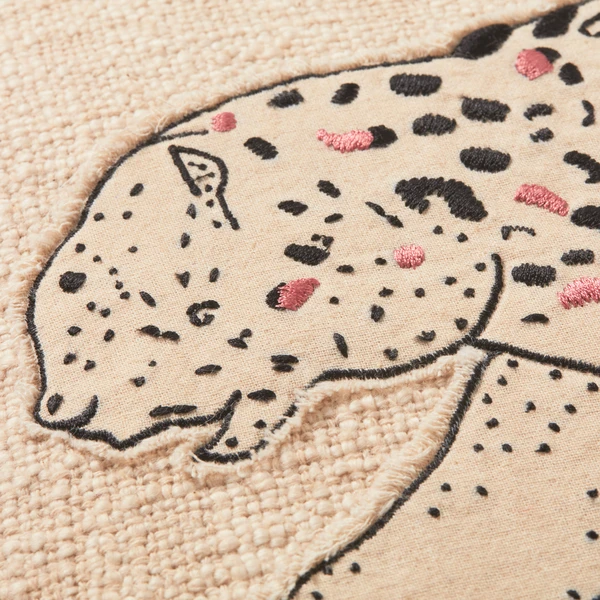 Crafted in 100% Cotton, the Leopardess Pillow displays a whimsical leopard character on an all over ivory base along with a fun black and pink detail embroidery and a black flanged edge, making it a playful add to any room!