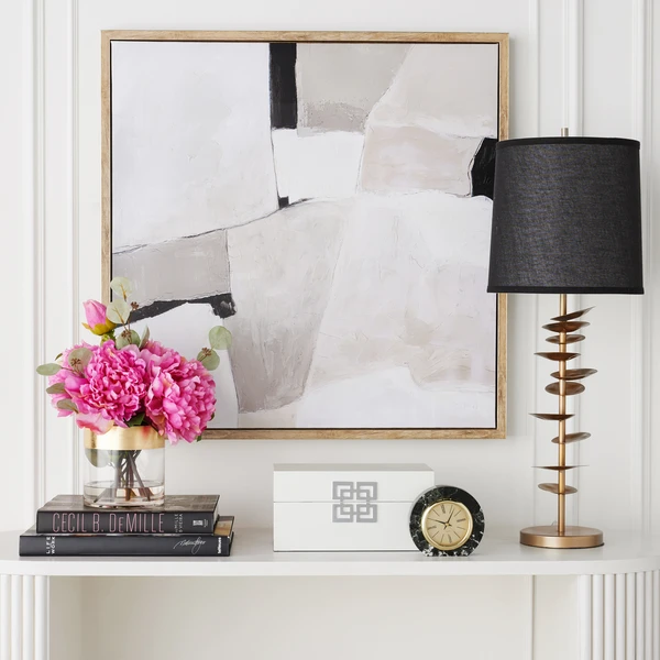 This pre-made faux floral arrangement features a stunning display of open pink peonies, elegantly arranged in a clear glass vase. A thick gold stripe on the vessel adds a touch of sophistication and glamour to this timeless piece of decor.