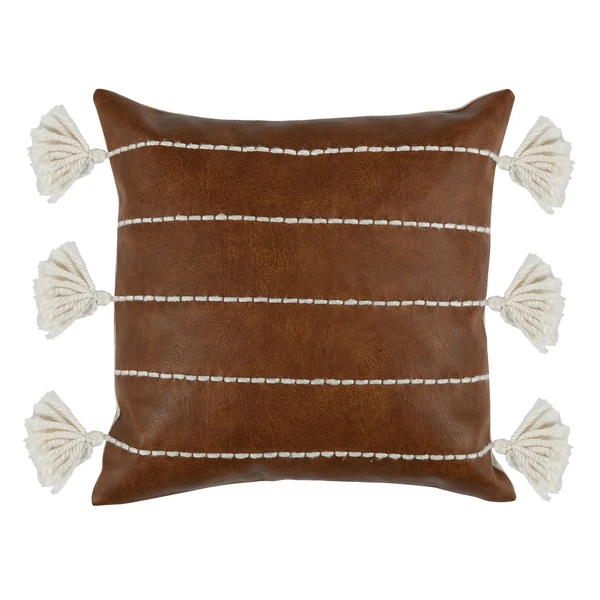 Classic with a dash of playfulness, our Zeek faux leather pillow features classic stripes accented with plush tassels. Hand embroidery gives Zeek an artisan aesthetic while its neutral hues and timeless design that suits any decor